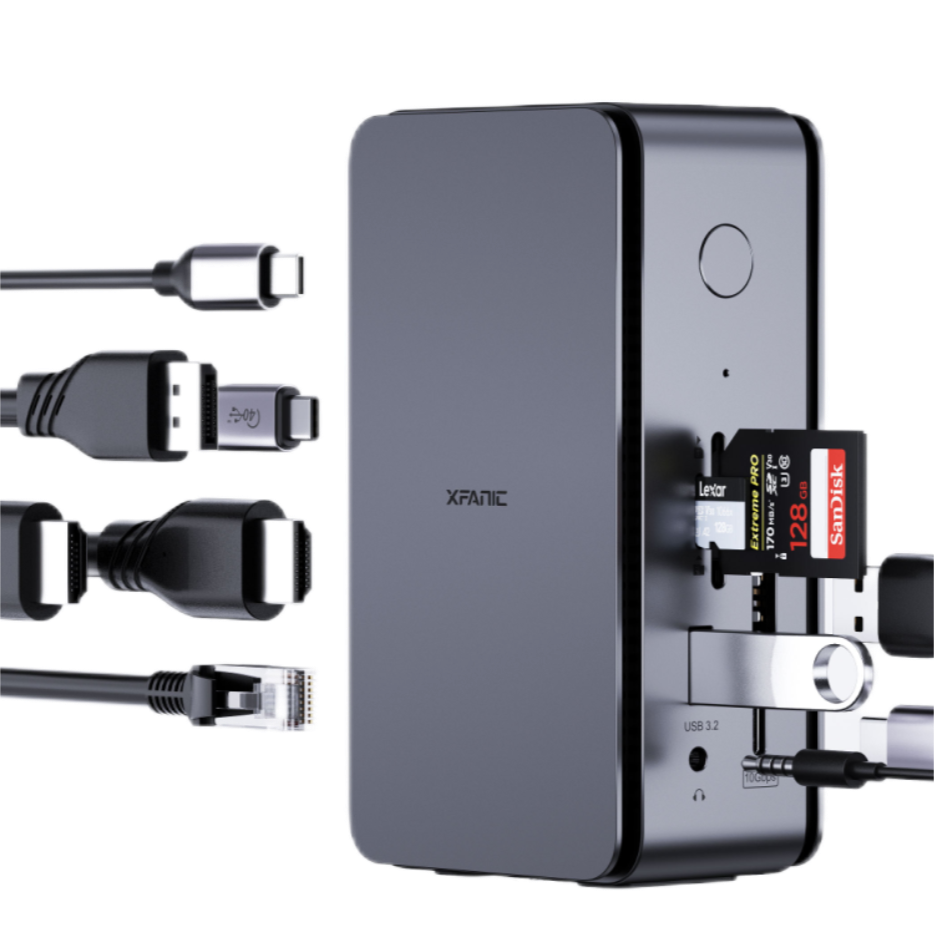 ? 輸出:1×HDMI2.1+1×HDMI2.0+1×DP1.2+2×TYPE C-A(10Gbps)+1×TYPE C-C(10Gbps)+1×RJ45(2.5Gbps)+2×SD/TF4.0+1×Audio3.5+1×TYPE C-C(PD)+1×SSD(M2.SSD)