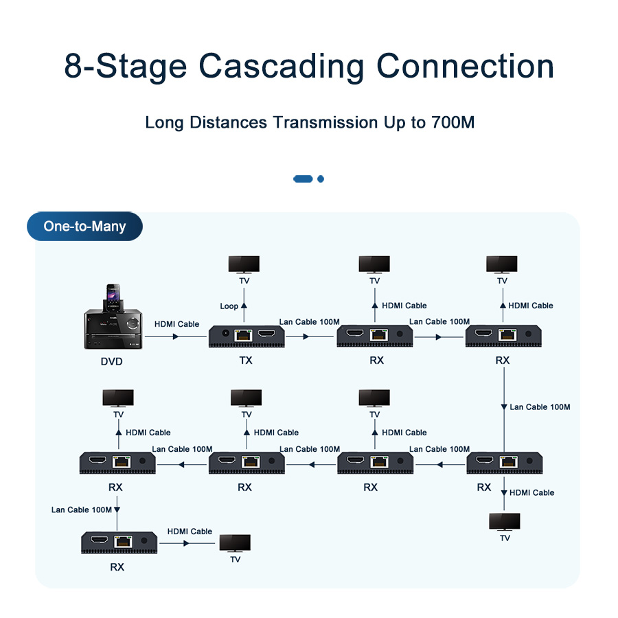 4K@30Hz(100米), 1080p@60Hz(100米), 支持級聯(lián)延長, 支持畫面環(huán)出, 支持紅外接控制.